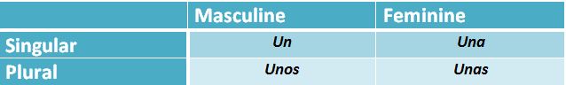 Indefinite Articles:un = a una = a unos = an unas = an ↓ ↓ ↓ ↓masculine, feminine, masculine, feminine, singular singular plural pluralThe article has to match the:* gender (masculine or feminine)* number (singular or plural)------------------------------------------------------------------------------------------------------------------------Examples: * man = hombre → masculine * woman = mujer → feminine* flower = flor → feminine* car = coche → masculine * a man = un hombre → masculine, singular* a woman = una mujer → feminine, singular* some men = unos hombres → masculine, plural * some women = unas mujeres → feminine, pluralChart Summary: