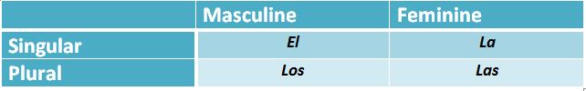 Definite Articles:el = the la = the los = the las = the ↓ ↓ ↓ ↓ masculine, feminine, masculine, feminine, singular plural singular plural The article has to match the:* gender (masculine or feminine)* number (singular or plural)------------------------------------------------------------------------------------------------------------------------------Examples:* the man = el hombre → masculine, singular* the man = los hombres → masculine, plural* the woman = la mujer → feminine, singular * the women = las mujeres → feminine plural * the car = el coche → masculine, singular * the cars = los coches → masculine, plural * the flower = la flor → feminine, singular* the flowers = las flores → feminine, pluralChart Summary: