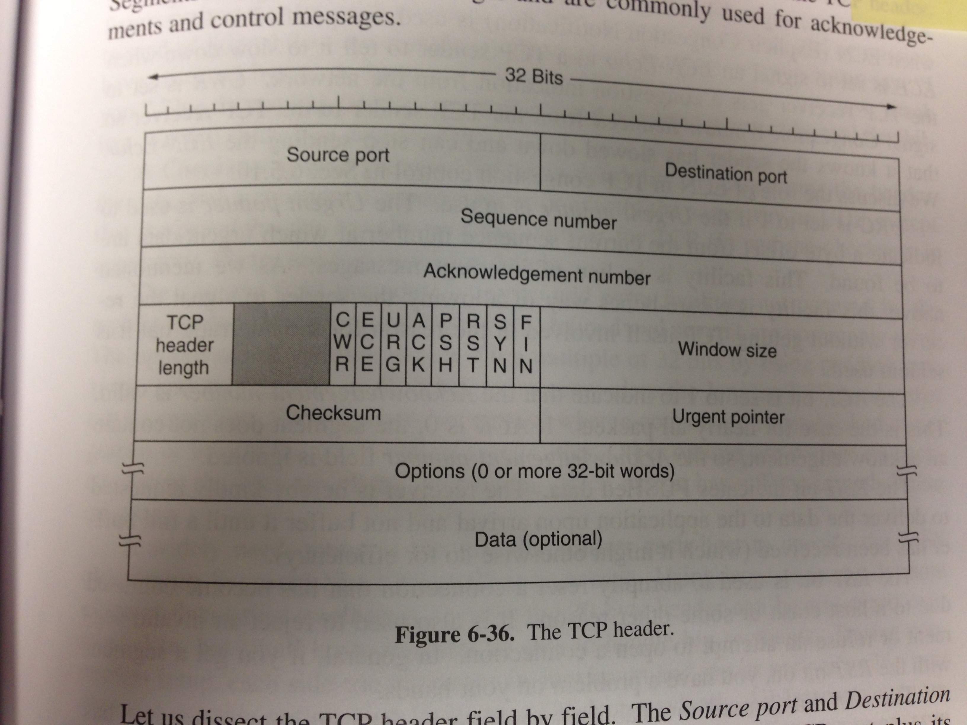 The TCP Header is 20 bytes in size and consists of many fields of data.The fields are:CWRConnection window reduced. Sent from the sender to the receiver to let it know the ECE was received and so it has slowed down.ECEUsed to signal congestion when ECN is used.URGUrgent pointer. Indicates a byte offset from the current sequence number, Where urgent data is to be found.ACKAcknowledgement number is valid. Set to 1 for nearly all packets, if it is 0 then there is no acknowledgement number set.PSHPUSHed dataRSTReset. Used to abruptly reset the connection.SYNUsed to establish connections by the 3-way handshakeFINUsed to flag a disconnect