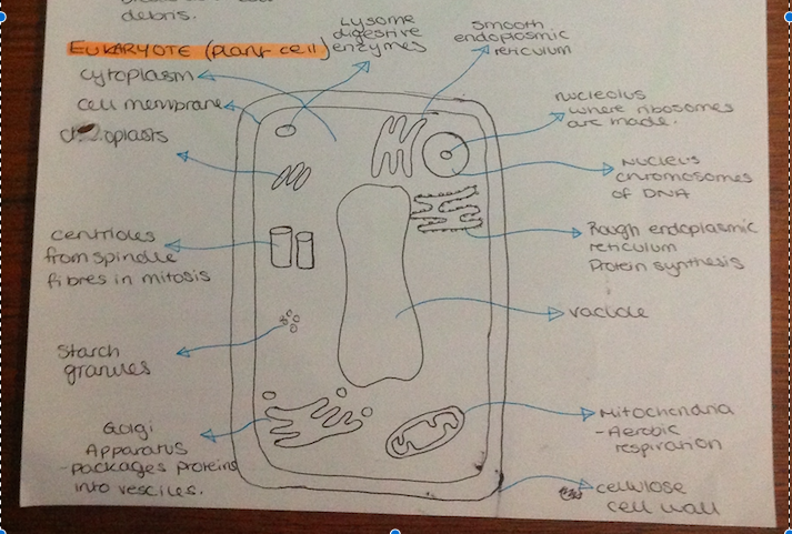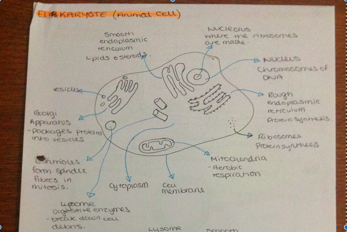 Cell StructuresDescription and FunctionCell wall: An outer layer of cellulose or chitin; not found in all eukaryotes. Provide rigidity, tensile strength and structure. Cell membrane: A phospholipid bilayer containing proteins and other molecules. A partially permeable barrier.Nucleus: Enclosed by an envelope. Composed of two membranes perforated by pores. Contains chromosomes of DNA.Nucleolus: A dense body within the nucleus. Assembles ribosomes.Centrioles: Hollow cylinders made up of a ring of nine protein microtubules. The proteins are arranged in a helix to form a hollow tube. Form spindle fibres in mitosis.Cytoplasm: Mainly water that also contains enzymes, salts, organelles and various organic molecules. Chemical reactions occur here, substances can be moved around easily.Smooth endoplasmic reticulum: A system of interconnected membrane-bound flattened sacs. Formation of lipids and steroids.Rough endoplasmic reticulum: A system of interconnected membrane-bound flattened sacs. Ribosomes attached to the outer surface. Formation of proteins.Golgi apparatus: Stacks of flattened membrane-bound sacs formed by fusion vesicles from the ER. Packages proteins into vesicles.Lysome: Vesicles containing digestive enzymes. Break down cell debris.Mitochondria: Have a double membrane. Inner membrane folds into a structure called cristae. Fluid inside the membrane is called the matrix. Aerobic respiration.Ribosomes: Made of RNA and protein. These small organelles are found free in the cytoplasm or attached to endoplasmic reticulum. Protein synthesis.Chloroplasts: A structure found in eukaryotic plant cells that contain chlorophyll for photosynthesis.