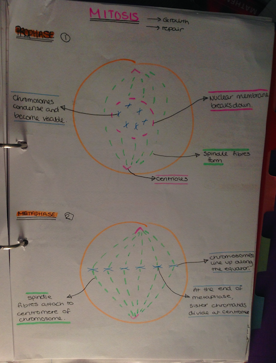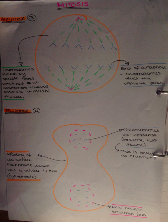 Mitosis - Nuclear divisionDuring Mitosis replicated chromosomes are separated and the cell divides, producing two new identical cells.Although mitosis is a continuous process, it is divided into four stages (prophase, metaphase, anaphase and telophase) to more easily describe the processes occurring during its progression.The purpose of mitosis is for growth and repair.*Cytokinesis occurs after mitosis and is when the cytoplasm divides and the two cells separate. It is part of the M1 phase but is different to nuclear division. In plants --> Cytokinesis involves the construction of cell plate in the middles of the cell. cell wall materials are delivered by vesicles. Vesicles become the plasma membranes of the new cell surfaces.In animals --> In an energy using process, the cleavage furrow moves inward forming a region of separation where the two cells separate.