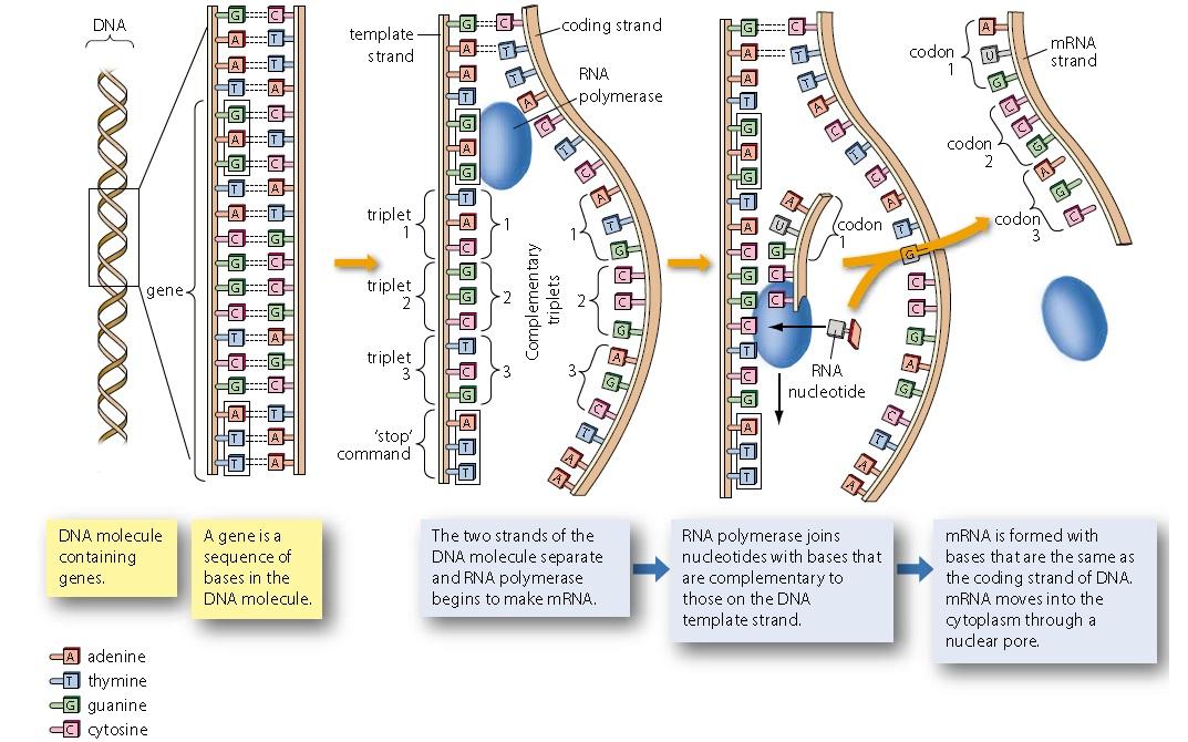Transcription RNA polymerase breaks apart the DNA strands A single strand of mRNA is transcribed from the template strand using the base pair rule In mRNA, the nucleobase T is substituted by U Required nucleotides for mRNA synthesis are found freely in the nucleus