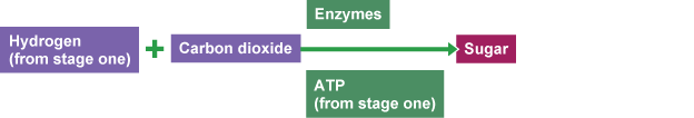in the second stage of photosynthesis, hydrogen from the first stage and carbon dioxide from the first stage is used to make sugar (glucose) carbon fixation is a series of reactions which requires energy each reaction is controlled by an enzyme the energy needed comes from ATP