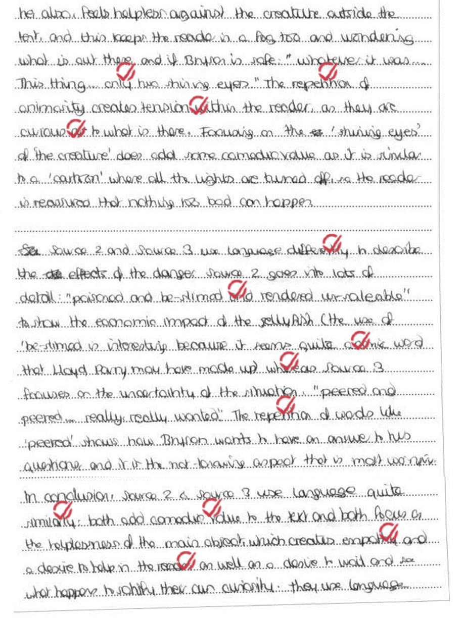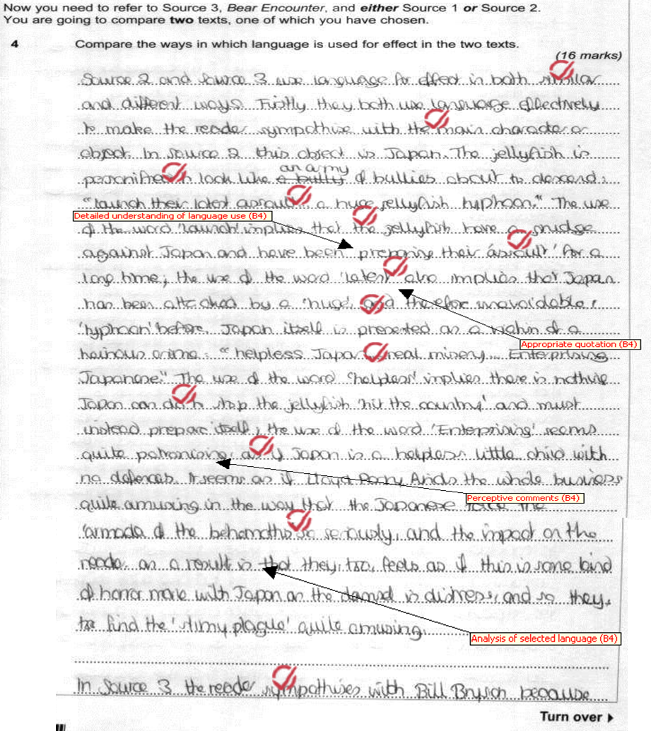 This is an actual student response from the 2013 January Higher Paper [Paper 1]What makes it a good (14/16 mark) is: It identifies relevant 'language techniques' It then gives examples of the 'language technique' being used - this is in the form of a 'direct quotation' It then develops this identification/evidence link by adding a 'relevant explanation of effect' on the reader. N.B. a 'relevant explanation' of effect goes beyond simple comments such as 'makes you interested' or 'makes you read on' - these are often Band 2 'some attempt' territory It is also consistent, in that it does the good things time after time. The response follows a very simple pattern but shows consistently good application of the basics that, pretty soon, goes beyond Band 3 answer ('Clear and Relevant') to Band 4 ('Perceptive and Detailed').