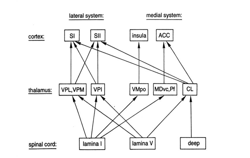 Fig. 1. Cortical areas that receive information from the spinothalamic tract. Main spinothalamic and thalamocortical projections were summarized and simplified from several reports on the central nociceptive pathways in the monkey (Vogt et al., 1979; Willis, 1985; Apkarian and Shi, 1994; Craig, 1996). Cortico-cortical connections are not shown. ACC, anterior cingu- late cortex; CL, centrolateral nucleus; MDvc, ventrocaudal part of medial dorsal nucleus; Pf, parafascicular nucleus, SI, primary somatosensory cor- tex; SII, secondary somatosensory cortex; VMpo, posterior part of ventro- medial nucleus; VPI, ventral posterior inferior nucleus; VPL, ventral posterior lateral nucleus; VPM, ventral posterior medial nucleus.