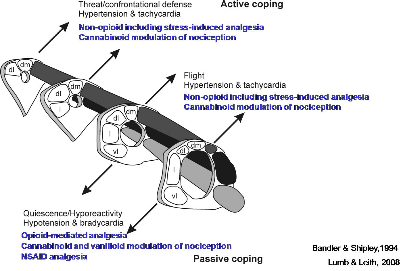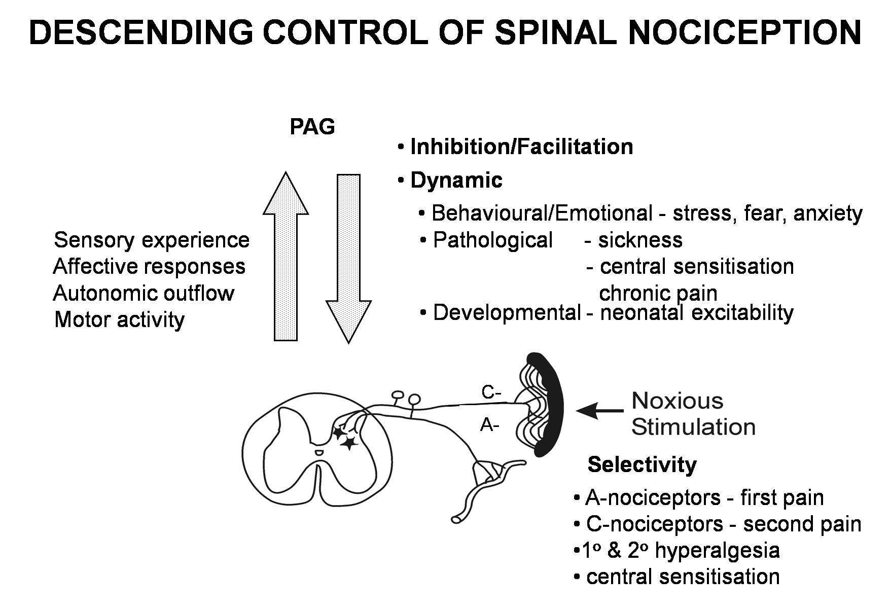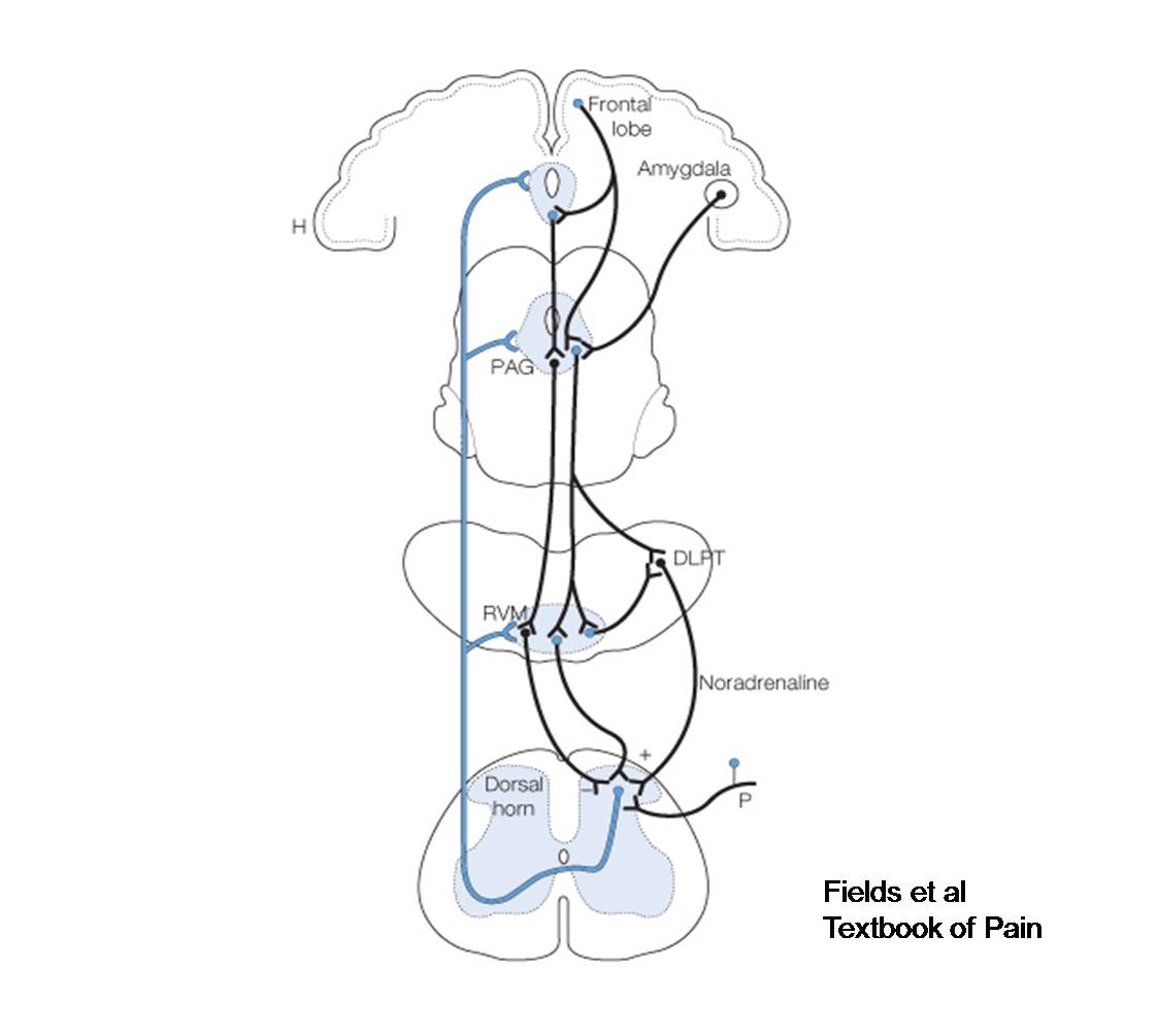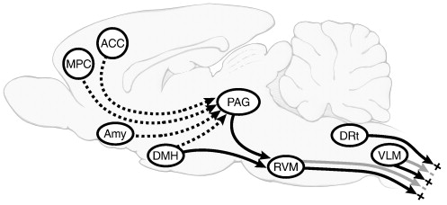Fig. 1. Schematic illustrates main topics of this review: midline PAG-RVM system, which exerts bidirectional control over dorsal horn nociceptive processing, and the DRt and VLM in the caudal medulla. DRt is thought to be facilitating, and VLM primarily inhibitory, although it may, like the RVM, have both an inhibitory and facilitatory influence. The PAG especially, but also the RVM, DRt and VLM (not shown) receive important direct and indirect inputs from limbic forebrain areas including anterior cingulate cortex (ACC), amygdala (AMY), dorsomedial nucleus of the hypothalamus (DMH), and medial prefrontal cortex (MPC).