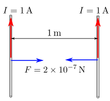 Forces between currents If two current-carrying conductors are placed in close proximity to one another, they will exert a force on each other due to their magnetic fields The unit of current, the ampere, is based on this principle The ampere is the steady current which, if maintained in two straight parallel conductors of infinite length, of negligible cross section and placed one metre apart in a vacuum would produce a force on each conductor of 2 × 10*-7 newtons per metre of length
