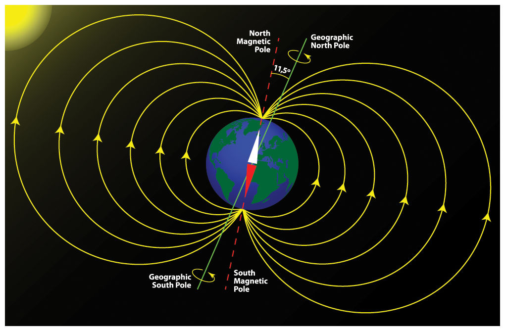 The Earth's Magnetic Field The Earth has a massive magnetic field around it It acts as if there is a giant bar magnet in its centre This magnetic field is what protects the Earth from solar radiation The location of the north and south magnetic poles are close to, but not in the same place, as the geographic poles