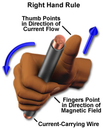 Magnetic Field due to Current When current flows through an object, it creates a magnetic effect To find out the direction of the magnetic force, we use the "Right hand rule" If you curve your right hand around a current-carrying wire, when your thumb is pointing in the direction of the current, your fingers indicate the direction of the magnetic field