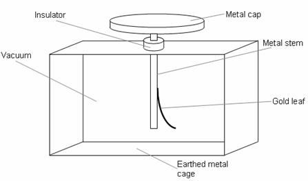 Components of a Gold Leaf Electroscope: A metal cap, that is attached to A metal rod, which passes through An insulating plug, into An earthed container with a glass front A gold leaf that is attached near the base of the metal rod