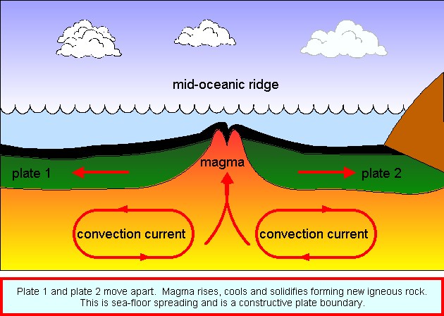 Sea floor spreading happens at mid-ocean ridges. Mid Ocean Ridges are mountain ranges underneath the ocean. In the middle of the ridge is a volcano. These volcanoes do not erupt the way volcanoes on the surface of the earth do BUT magma does come out of them.When the magma comes out, it hardens. As it hardens it pushes away the sea floor that was already there. This is how the sea floor grows or spreads.