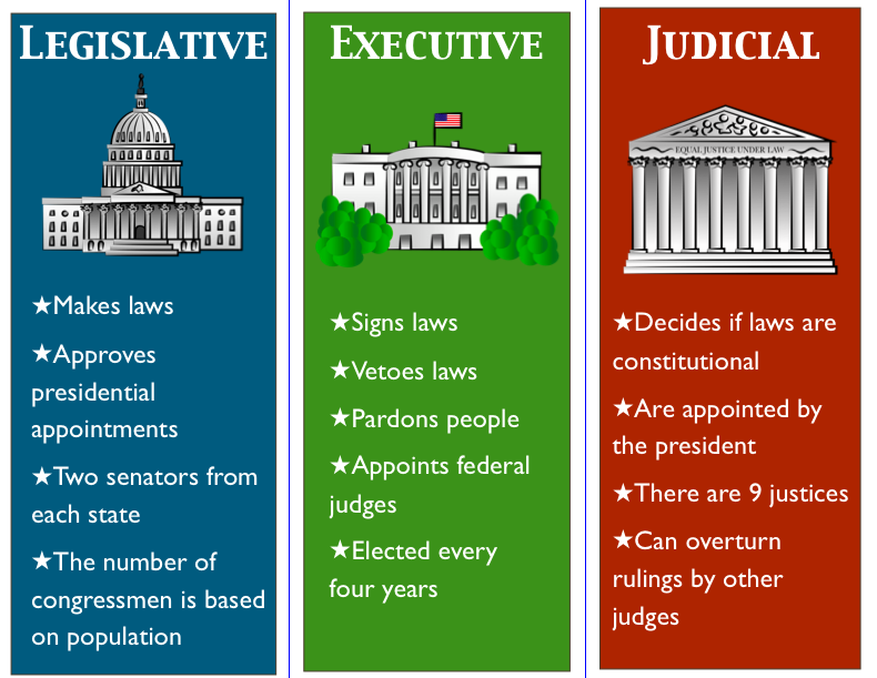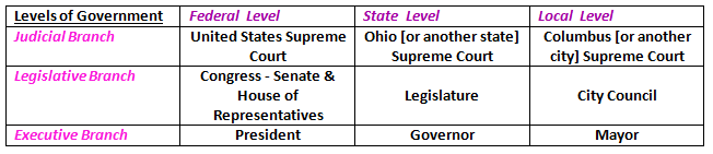 The U.S. government has three branches of government and each of these branches "checks" the other branches to verify the power is balanced. This is an example of the system called separation of powers. Shown below is a table showing each level and each branch and what the names are.