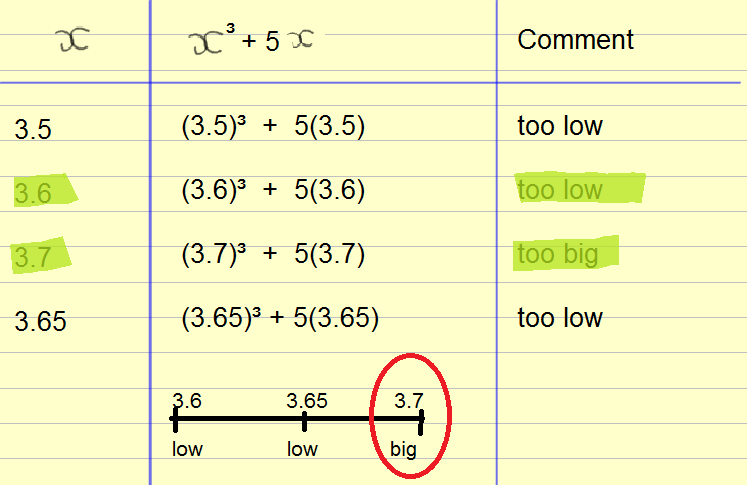 The equation:x³ + 5x = 67has a solution between 3 and 4 Use a trial and improvement method to find a solution.Give the solution to one decimal place.