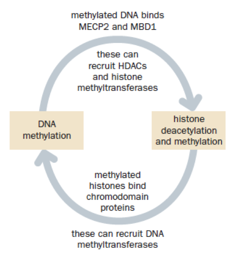 MECP2 (mutation in Rett Syndrome)MBD1 these are proteins that bind to methylated DNA, suppressing transcriptionHDAC = histone deacetylase