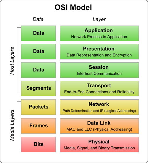 A Basic Overview1. Physical LayerThe Physical Layer ensures the transmission of binary data via a medium. It defines cabling, or other methods of data carriage, connectors, electrical characteristics of the communication channel and the transmitted signal. It also defines the protocol to establish and terminate a connection between two 'directly' connected nodes.The NIC converts the binary data into electrical voltages (high and low). Devices that operate on the Physical Layer include network interface cards, hubs, switches, bridges and routers etc. However, some of these devices do work on other layers as well.2. Data Link LayerThe Data Link Layer provides a reliable link between two directly connected nodes. It does this by detecting and possibly correcting any errors that may occur in the Physical Layer. It also ensures that all of the data from the sending computer has been received, thereby, providing flow, error control, and synchronisation of the Physical Layer.Error detection prevents two computers from accessing the same media simultaneously i.e. collision detection. The Point-to-Point Protocol (PPP) is an example of the Data Link Layer in the TCP/IP stack.3. Network LayerThe Network Layer manages the transfer of packets that are to be forwarded on to different networks, between nodes on the same network. Network Addressing and determining the best path are two operations carried out on this layer. Data is routed through a network and can also be routed through interconnected networks. Splitting the data up for transmission and re-assembling upon reception. The IP part of TCP/IP also operates at this level.4. Transport LayerThe Transport Layer manages any end-to-end messages delivered on the network. It provides a reliable and sequential packet delivery through error recovery and flow control mechanisms. It can also keep track of the segments and provides the ability to resend any failed segments and acknowledge the successful delivery before sending the next packet of data.5. Session LayerThe Session Layer manages the communication between applications after a connection is made. It sets up the session, manages information exchanges, and then breaks it down when the session ends.The Session Inter-Host Communication sets up, maintains, and closes down a session. This operation provides an open communication path with another system.6. Presentation LayerThe Presentation Layer formats the data for exchange between the Application and Session layers. It masks the differences of data formats between dissimilar systems. It also encodes and decodes data, encrypts and decrypts data, compresses and decompresses data.Presentation Data Representation and Interpretation Translation may need to occur between two systems using different presentation standards e.g. different character sets or character codes. The Presentation layers allow data to be interpreted using a set of translations and can also add data encryption for security purposes.7. Application LayerFinally, the Application Layer provides the user interface for communication. These functions typically include; email, file transfer, file management, message handling and database query functions.Application Network Services to Application Programs provides network services to application programs such as electronic mail and file transfer. This includes Telnet, SSH, FTP, TFTP, etc.