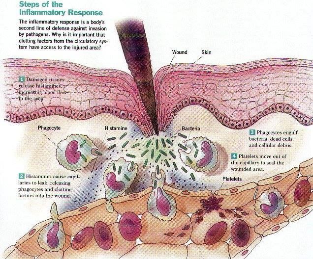 When tissue is damaged for example a poke in the skin with a nail, bacteria is released in the interstitial fluid. The tissue cells immediately release chemical messengers (chemokinds), and the mast cells release histamines. Histamines cause the capillary endothelial cells to become larger and more further apart (called vasodilation) this also causes blood flow to increase (increased vascular permeability). Phagocytes (white blood cells) are released from the capillaries (emigration of white blood cells). The phagocytes begin to engulf the bacteria and dead cells. Platelets move out of the capillary to seal the wounded area.