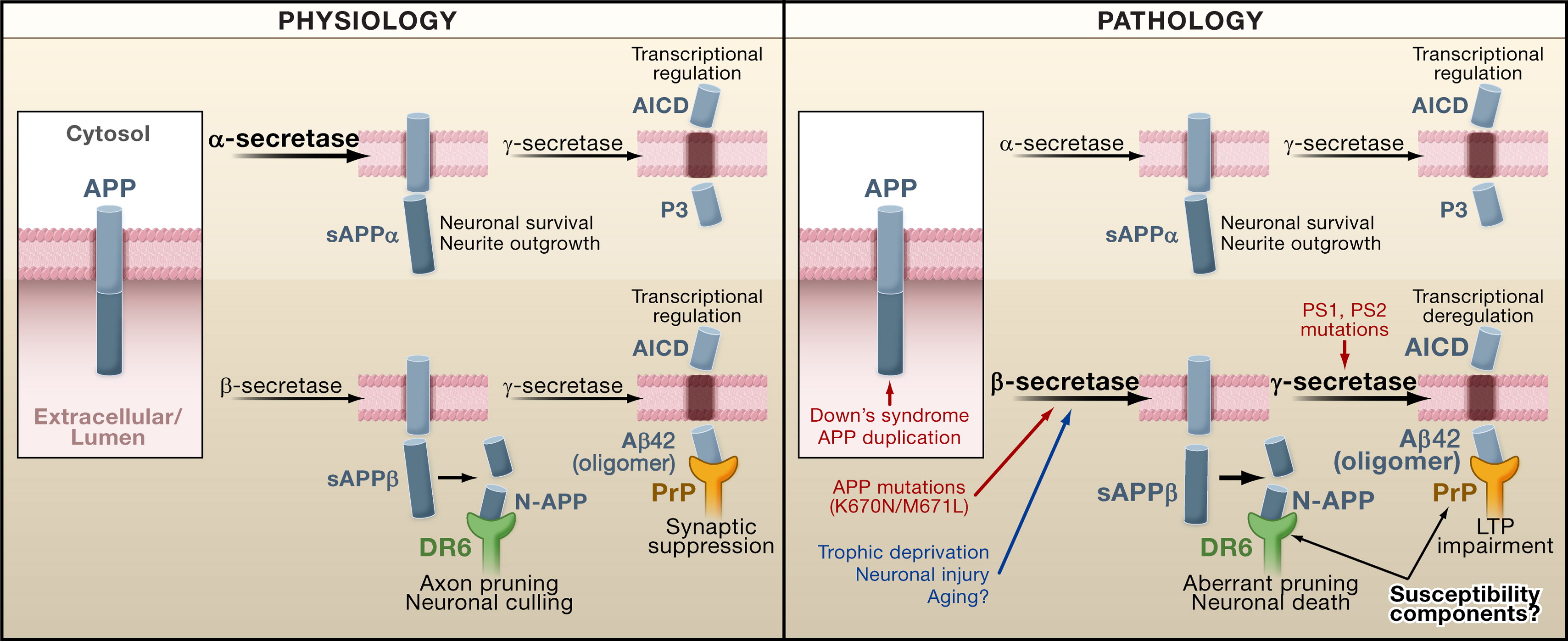 Figure 1. APP Processing in Physiology and Pathology(Left) APP is cleaved by α-secretase or β-secretase, and then by γ-secretase to produce various APP products, including N-terminal APP fragment (N-APP), amyloid-β peptide (Aβ), and APP intracellular domain (AICD). The various fragments perform distinct physiological functions: N-APP induces axonal pruning and neuronal culling by binding to DR6, and Aβ42 oligomers maintain synaptic homeostasis by binding to the prion protein (PrP). (Right) During AD pathogenesis, APP processing is increased or altered by genetic factors such as trisomy 21 in Down's syndrome, mutations in APP, or putative sporadic mechanisms. The resulting increase in Aβ42 and N-APP impairs synaptic plasticity and induces aberrant neuronal and axonal degeneration in a temporal and/or spatial pattern that may be dependent on the expression of the receptors PrP and DR6. Red, genetic factors driving APP processing; blue, possible events inducing sporadic AD; PS1 and PS2, presenilin 1 and 2.