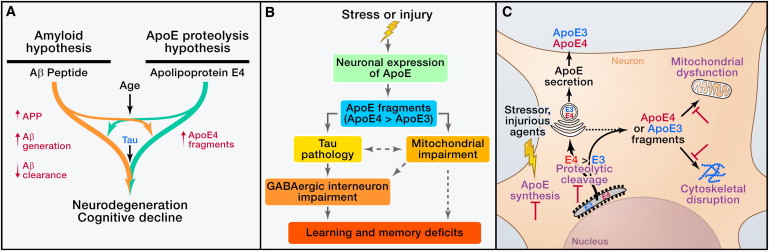 Figure 2. Aβ in AD Pathogenesis and Related Therapeutic Strategies(A) Pathogenic Aβ assemblies cause tau-dependent aberrant excitatory network activity and synaptic depression, which may lead directly, or indirectly through hippocampal remodeling, to cognitive dysfunction. Identification and blockade of the upstream mechanisms that trigger this cascade are important objectives.(B) Aβ-dependent aberrant network activity may be caused by impairments of inhibitory interneurons resulting from depletion of voltage-gated sodium channel subunits (VGSC), intracellular activities of neurotoxic apoE4 fragments, or elevated metenkephalin (Enk) levels. Additional mechanisms that may cause neuronal overexcitation in AD include impairment of glutamate transporters (e.g., GLT1), resulting in decreased clearance of glutamate (Glu), and increased neuronal or microglial production of factors that promote excitotoxicity, including arachidonic acid (AA) and quinolinic acid (Quin).(C) hAPP mice have depletions of the VGSC subunit Nav1.1 that impair the function of parvalbumin (PV)-positive inhibitory interneurons (PV cells), resulting in reduced intensity of gamma oscillations and network hypersynchrony. These network abnormalities can be prevented by increasing Nav1.1 levels in PV cells (1) and counteracted, at least temporarily, by behavioral interventions that enhance gamma activity (2).(D) Aβ may impair neuronal functions by receptor-mediated and receptor-independent mechanisms. Potential therapeutic strategies include (1) lowering Aβ production with secretase inhibitors or modulators and enhancing Aβ clearance with antibodies or activation of Aβ-degrading enzymes, (2) blocking the interaction of Aβ with cell surface receptors, and (3) modulating downstream pathways to make the brain more resistant against whatever Aβ cannot be removed effectively and safely.
