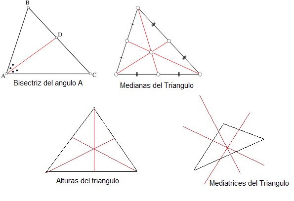 Lineas y puntos en un trianguloSe llama altura de un triángulo al segmento de recta que une un vértice del triángulo con el lado opuesto -o su prolongación- formando un ángulo recto. El lado opuesto es la basedel triángulo. Todos los triángulos tienen tres alturas. Estas 3 alturas se cortan en un punto único (son concurrentes), llamado ortocentro del triángulo.Se llama mediatriz de un lado de un triángulo a la recta perpendicular a dicho lado trazada por su punto medio (también llamada simetral). El triángulo tiene tres mediatrices, una por cada uno de sus lados , y y el punto donde se encuentran las mediatrices se llaman Circuncentro.Las bisectrices de un triángulo son las bisectrices de sus ángulos. Existen bisectrices internas (las usuales) y externas a estos ángulos.Las tres bisectrices internas de un triángulo son concurrentes en un punto O, llamado Incentro.El segmento de recta que va de un vértice al punto medio del lado opuesto de un triángulo se llama mediana . En algunos países (por ej: Chile) se las llama transversales de gravedad.Las tres medianas de un triángulo concurren en un punto -punto G- llamado centroide o baricentro del triángulo.