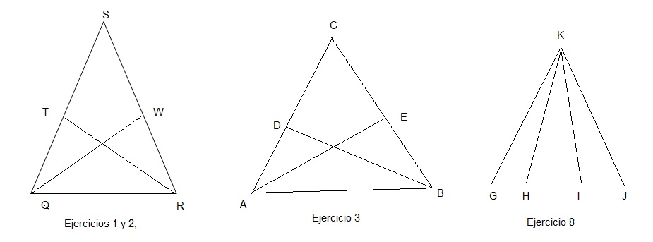 Ejercicios: 1. Demostrar que los triángulos TQR y WRQ son congruentes, si los ángulos SQR y SRQ son congruentes; T es el punto medio del segmento QS; W es el punto medio del segmento RS y además los segmentos QS y RS son congruentes.2. Demostrar que los segmentos TR y QW son congruentes, en el ejercicio 1. 3. El triángulo ABC es isósceles con los segmentos AC y BC congruentes. El punto D es el punto medio del segmento AC y E es el punto medio de BC. Demostrar que los triángulos ACE y BCD son congruentes.4. Demostrar que la bisectriz del ángulo recto de un triángulo rectángulo-isósceles, lo divide en dos triángulos congruentes. 5. Demostrar que la altura sobre la hipotenusa de un triángulo rectángulo-isósceles, lo divide en dos triángulos congruentes. 6. Demostrar que la mediatriz sobre la hipotenusa de un triángulo rectángulo-isósceles, lo divide en dos triángulos congruentes. 7. Demostrar que la mediana sobre la hipotenusa de un triángulo rectángulo-isósceles, lo divide en dos triángulos congruentes.