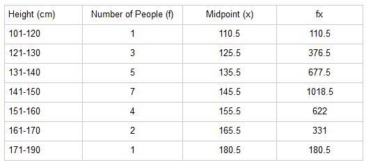 Height (cm) Number of People (f) Midpoint (x) fx 101-120 1 110.5 110.5 121-130 3 125.5 376.5 131-140 5 135.5 677.5 141-150 7 145.5 1018.5 151-160 4 155.5 622 161-170 2 165.5 331 171-190 1 180.5 180.5 In this example, the data is grouped. You couldn't find the mean the "normal way" (by adding up the numbers and dividing by the number of numbers) because you don't know what the values are. You know that three people have heights between 121 and 130cm, for example, but you don't know what the heights are exactly. So we estimate the mean, using "∑fx / ∑f". A good way of setting out your answer would be to add two columns to the table, as I have.  "Midpoint" means the midpoint of each of the groups. So the first entry is the middle of the group 101-120 = 110.5 . Now, ∑fx (add up all of the values in the last column) = 3316.5 ∑f = 23 So an estimate of the mean is 3316.5/23 = 144cm (3s.f.) This short video shows you how to find the mean, mode and median from a frequency table for both discrete and grouped data.