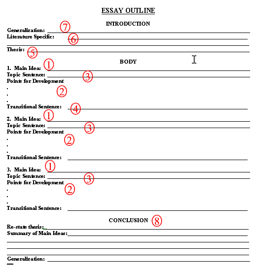 Follow these steps in this order to get the most of your outline.1. Main Idea: After deciding on what topic you are going to choose, reading or scanning through the literature, and developing a working thesis, you should have an idea of what the main points of your essay will be. Write the main idea for each paragraph in the "Main Idea" space. (These will not be written "as is" in your essay, but will serve as guidelines for you as you prepare your outline.) 2. Points for Development: Place your points of evidence in the spaces provided. Each point you want to make (a, c, e, g) should be supported with a specific detail (quotation or described detail) from the story (b, d, f, h) to prove your arguments. Each body paragraph should have three or more points of support. 3. Topic Sentence: By using the points of evidence (See 2), you can then summarize what the paragraph will be presenting. Put that here in one or two complete sentences for each body paragraph. This should convey the main idea of the paragraph to your reader. 4. Transitional Sentence: By looking at the "Topic Sentences" for each paragraph, you can make a transitional sentence which flows between the two paragraphs. In your essay, this will be the last sentence of the paragraph. You will examine this step in greater detail, later in this lesson. 5. Thesis Statement: Revise your working thesis. By summarizing your two or three "Topic Sentences", you can make a thesis statement. Make sure the thesis is one that will be supported by all of the body paragraphs, and be sure it answers the question which was posed to you. No matter how good your essay is, you have to address the question to get a good mark. 6. Literature Specific Statements: Working backwards through the introduction, you can then summarize the literature and introduce how it fits into the question. 7. Generalization: Review the question again, and make a generalized statement about life, society, or people, that reflects what you are about to present. 8. Conclusion: Similar to the introductory paragraph, but in reverse. Restate the thesis, using different words. Sum up the main points of your essay and/or state what has been learned, either by the reader or by the character you have been discussing. Then, make another generalized societal statement, similar to the first, but focusing more on what has been learned. With the outline complete, the essay will be essentially finished. All you will have to do next is to arrange the information into complete functional sentences, and finish the six steps.