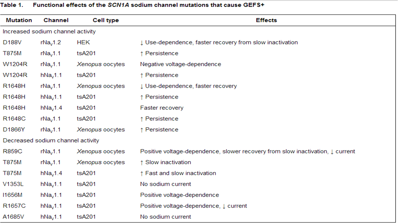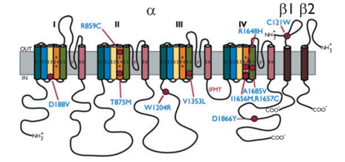 Figure 1. Epilepsy-causing mutations in SCN1A. Schematic diagram of the Nav1.1 sodium channel α subunit and associated β1 and β2 subunits. The Nav1.1 α subunit is associated noncovalently with β1 or β3, and it is associated via a disulfide linkage with either β2 or β4. The α subunit consists of four homologous domains (I–IV), each containing six transmembrane segments (S1–S6). The voltage-sensing S4 segment has multiple, positively charged amino acids (+), and the intracellular loop between domains III and IV functions as the inactivation gate, containing four residues (IFMT) that interact with the inactivation docking site. The GEFS+ mutations that are mentioned in this review are indicated by filled circles. A complete list of the epilepsy-causing mutations in SCN1A can be found at http://web.scn1a.info (Lossin, 2009) andhttp://www.molgen.ua.ac.be/SCN1AMutations/ (Claes et al., 2009).