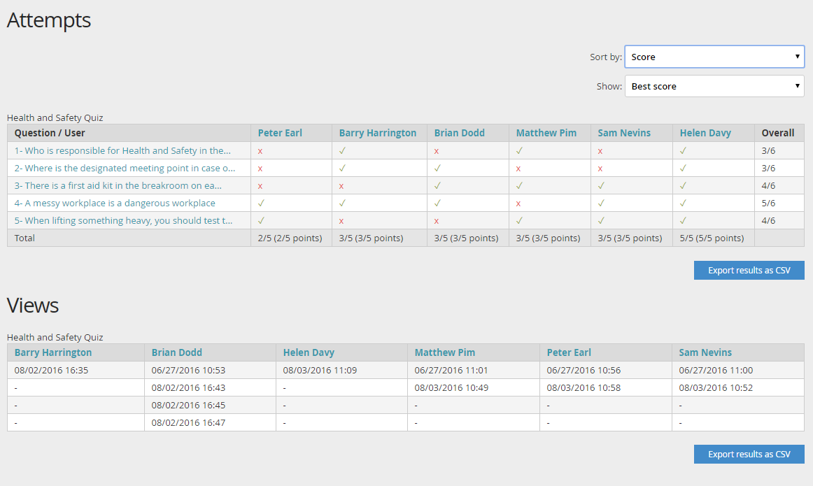 Once you are happy with your selections, clicking the Run Report button will bring up a performance overview displaying user scores, a breakdown of how they performed on each question, and the number of times a piece of content was viewed, by whom and when. You can sort these results by user name or by score.Such information is valuable for determining what learning or training style works best per user, and allows you to make changes to your content and learning strategies in order to increase their overall effectiveness.
