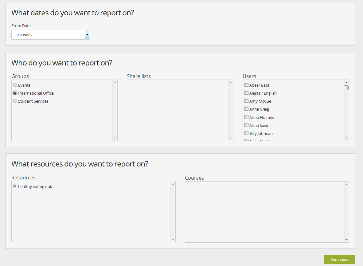 Running a Report lets you see how users are performing on company Quizzes. When doing this, you will be presented with a number of options so that you can customise your Report in order to obtain the information you are looking for.For example, you can choose the start date the Report to measure progress over time; select the Groups or content you wish to run a Report on; or opt to generate a Report on an individual user, or tailored Group of individuals.