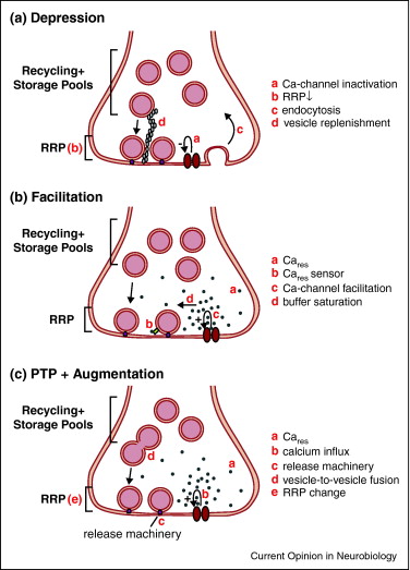 Figure 1. Presynaptic mechanisms of use-dependent short-term plasticity. Schematic diagrams illustrate proposed mechanisms for depression (a), facilitation (b), and post-tetanic potentiation (PTP) and augmentation (c). RRP: readily releasable pool of vesicles; Cares: residual calcium.