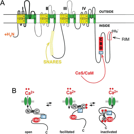 Site and mechanism of Ca2+ channel regulation. A, presynaptic Ca2+channel signaling complex. Sites of interaction of SNARE proteins (the synprint site) and CaM and CaS proteins on the α1 subunit are illustrated. B, model for sequential Ca2+/CaM-dependent facilitation and inactivation. Local rises in intracellular Ca2+ activate the two C-terminal Ca2+-binding EF-hands of CaM, strengthening interaction with the IQ-like motif and causing facilitation. Following prolonged Ca2+ entry, global rises in intracellular Ca2+ allow CaM to become fully liganded and to interact with both the IQ-like motif and CBD to produce inactivation. This figure was reproduced from Ref. 12 with permission.