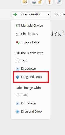 Choose 'Fill in the Blanks: Drag and Drop' or 'Label image: Drag and Drop' from question types under insert question dropdown menu.