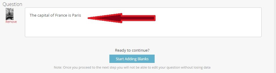Write out the whole question INCLUDING the word where you want the user to fill the blank. Then click 'Start Adding Blanks'.
