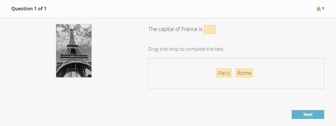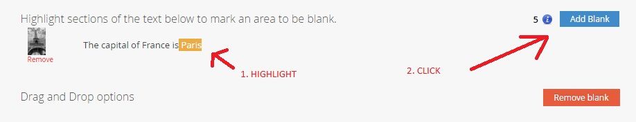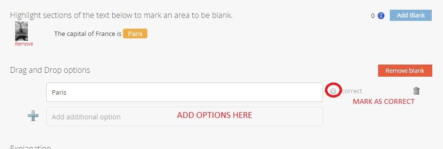 The user will see as many possibilities as you have added as answers. You may add more than one blank to a question but the responses are all presented together in a question - i.e. the user could try to put any of the answers in any of the blanks. As with all question types, you can add an explanation.