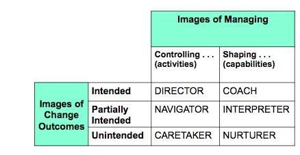 2 Extremes: Controlling and Shaping Director / Coach (not expertise - takes the best from people) Navigator (politician, animal, processual) / Interpreter (dialogue, sense making process, pro active) Caretaker (seat back, lifecycle approach, env. decides, invisible hand, determinism) / Nurturer ( encourage self org°, not in charge, decentralize change, change completely unpredictable) Politics: determine what will happen or not