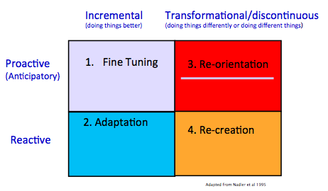 Scale of Change: Incremental: involve people (opposite of bureaucracy, manage and organize differently) high level of dependency tot the OD consultant, OD problematical from a business model pov? Transformational: change everything (system, structure strategy..), change the way an org° functions (1990s)