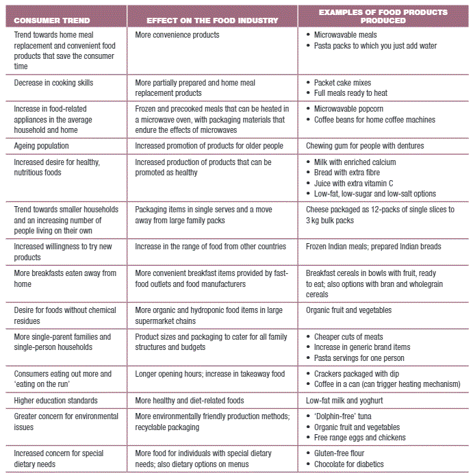 The changing in Australian society has resulted in demands for different foods. The demographics of a population; AgeIncome EthnicityGeographic location ^ these all have an effect on the food produced the following table outlines recent trends and the industry's response to these trends