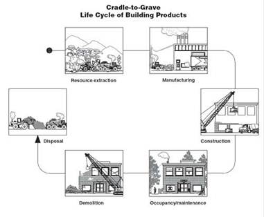 cradle to grave means to the beginning for end. For example in a building it’s the mines that produce raw materials produced for a house like clay. The grave is the end of the buildings life when it is demolished and put into landfill.
