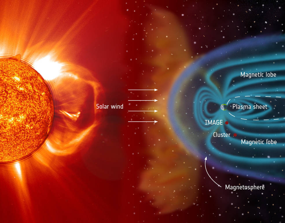 Solar Winds and Aurora BorealisWhen Solar Winds leave the sun they make a journey to the earths atmosphere, they first hit the earths magnetic field or the magnetosphere. This causes distortion on the the magnetosphere, which stretches the magnetosphere like stretching an elastic band. Once the tail has been stretched to its limit it gives off charged particles which in turn goes to the poles and then creates the aurora borealis through refraction.