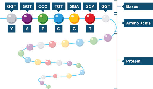 Each gene acts as a code, or set of instructions, for making a particular protein. Some of these proteins control the cell's internal chemistry. They tell the cell what to do, give the organism its characteristics, and determine the way its body works.To enable genes to code for proteins, the bases A, T, G and C get together not in pairs but in triplets. This is how it works: Each protein is made up of large numbers of amino acid molecules. Each triplet of bases codes for one particular amino acid. Amino acids are made in the number and order dictated by the number and order of base triplets. Finally, the amino acid molecules join together in a long chain to make a protein molecule. The number and sequence of amino acids determines which protein results.