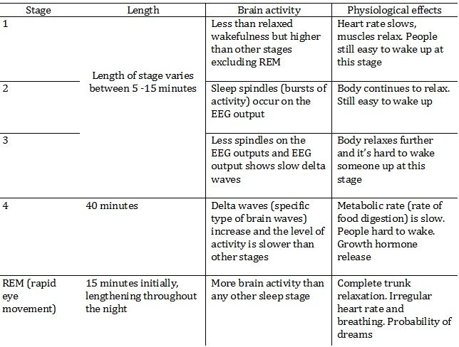 Over a course of 90 minutes an individual goes through stages 1-4 then returns to 3 and then 2 and then REM. The sleep cycle then begins again and the number of cycles depends on how long the person sleeps for.Dement and Kleitman- 1957AimsInvestigate brain activity change throughout night-time sleepProcedure 7 adult males and 2 adult females Participants reported to a lab at bedtime to have an EEG EEG measurements taken throughout the time asleep at night Participants told not to drink caffinated drinks before sleep was to be investigated Findings Everyone had REM periods during every night High incidences of dream recall when participants woke during REM periods of sleep. If woken in other stages dreams were not reported as often. Participants were woken up during 5-15 minutes into the start of REM sleep Brain activity of vivid dreams different to less clear dreams Rapid eye movements of participants during REM sleep varied according to dream type and mirrored rapid eye movements when awake and completing a similar task to the task dreamt about So they managed to identify the stage when dreams were most likely to occur Conclusion Sleep stages follow a typical pattern throughout the night Dreams occur mostly during the REM stage Evaluation Individual differences so findings cannot be generalised Useful as it helps to understand medical conditions and find new treatments Small sample sizes used so cannot be generalised Can be applied to finding out the best way to live life e.g. the best time to get to sleep or wake up etc.