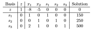 2) We form an initial tableau of coefficients. The variables as column titles, and rows being the coefficients in each equation.