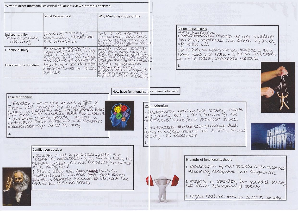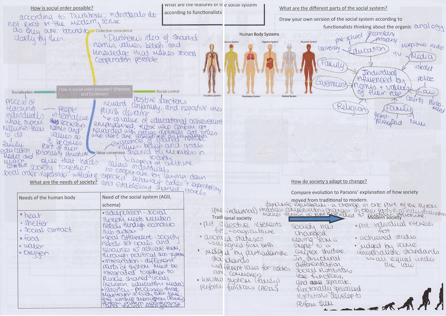 Key Terms: adaptation - a need of the social system; the social system meeting members' material needs through the economic sub-system functions - role of a particular thing goal attainment - a need of the social system; society needs to set goals and have resources to achieve them, through the political sub-system integration - a need of the social system; different parts of the system must be integrated together to pursue shared goals, this is achieved through social institutions such as the media, religion and education latency - a need of the social system; processes that maintain society over time, e.g. the kinship sub-system (family) perform pattern maintenance and tension management socialisation - learning norms and values of your culture social control - ways society gets us to obey shared norms social order - cooperation of individuals to obey norms and values and work towards shared goals system - an organised structure of interlinked parts system needs - things that are necessary for the system to keep working value consensus - shared values on what is important in society