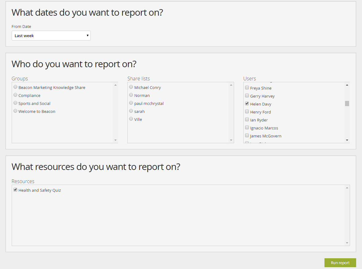 Running a Report lets you see how users are performing on company Quizzes. When doing this, you will be presented with a number of options so that you can customise your Report in order to obtain the information you are looking for.For example, you can choose the start date the Report to measure progress over time; select the Groups or content you wish to run a Report on; or opt to generate a Report on an individual user, or tailored Group of individuals.