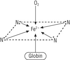 Haem in Haemoglobin Contains a Multidentate Ligand Haemoglobin is a protein found in blood that helps to transport oxygen around the body. Haemoglobin contains Fe2+ ions, which are hexa-coordinated - six lone pairs are donated to them to form six co-ordinate bonds in an octohedral structure. Four of the co-ordinate bonds come from a single multidentate ligand. Four nitrogen atoms from the same molecule co-ordinate around Fe2+ to form a circle. This part of the molecule is called haem. The other two co-ordinate bonds come from a protein called globin, and either an oxygen or a water molecule - so the complex can transport oxygen to where it's needed and then swap it for a water molecule: In the lungs, where the oxygen concentration is high, an oxygen molecule substitutes the water ligand and bonds coordinately to the Fe(II) ion to form oxyhaemoglobin, which is carried around the body in the blood. When oxyhaemoglobin gets to a place where oxygen is needed, the oxygen molecule is exchanged for a water molecule. The haemoglobin returns to the lungs and the whole process starts again. This process can be disrupted if carbon monoxide is inhaled. The haemoglobin swaps its water ligand for a carbon monoxide ligand, forming carboxyhaemoglobin. This is bad news because carbon monoxide is a strong ligand and doesn't readily exchange with oxygen or water ligands, meaning the haemoglobin can't transport oxygen anymore. Carbon monoxide poisoning starves the organs of oxygen - it can cause headaches, dizziness, unconsciousness and even death if it's not treated.