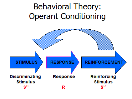 According to behaviourists, behaviour is learnt, not innate. There two types of conditioning to the learning theory - Classical and Operant. Classical learning through asoiciation while Operant is via positive reinforcement.