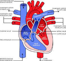 De-oxygenated blood flows into the right atrium from the body, via the vena cava.The blood then moves into the right ventricle, where it is pumped to the lungs via the pulmanory artery.Oxygenated blood from the lungs enters the left artrium via the pulmanory vein.The blood then moves into the left ventricle, it is then pumped all around the body via the Aorta