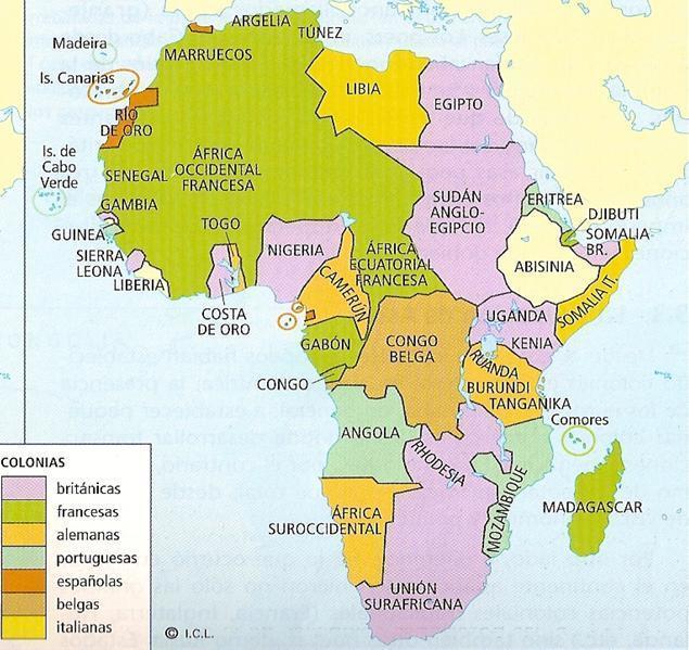 EL REPARTO DE ÁFRICAA principios del siglo XIX, África era un continente desconocido. Menos en las zonas costeras, el interior de África permanecía ignorado y estaba ocupado por tribus.A partir del Congreso de Viena en 1815,Reino Unido obtuvo la colonia de El Cabo. En 1830 los franceses ocuparon Argelia, los portugueses ampliaron sus factorías costeras de Angola y Mozambique. A partir de 1870, los países Europeos se empezaron a interesar por el interior del continente africano, y se produjo una autentica carrera colonizadora. En el reparto se dividió en el Norte, occidental austral y oriental pero algunos lugares como la cuenca del Congo y el valle del Nilo estuvieron muy reñidos por los distintos países.En 1898 se produjo la crisis Fachoda con el enfrentamiento de franceses y británicos para conquistar el dominio del curso medio del Nilo.Más tarde se enfrentaron europeos y los boers. Finalmente en el río Niger se acordó la libre navegación, que posteriormente el Reino Unido ocupó su salida del mar.
