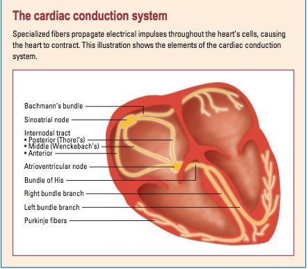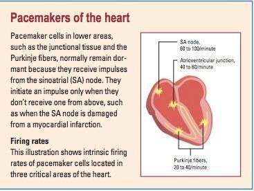 Important to know: Conduction starts at SA nods, to AV node, to bundle of His and Purkinje fibersSee below for firing rates in the even of damaged SA or AV nodes by myocardial infarction
