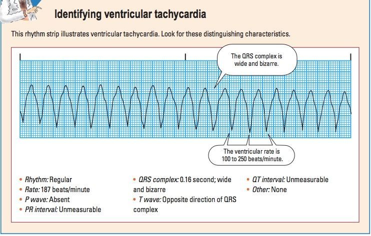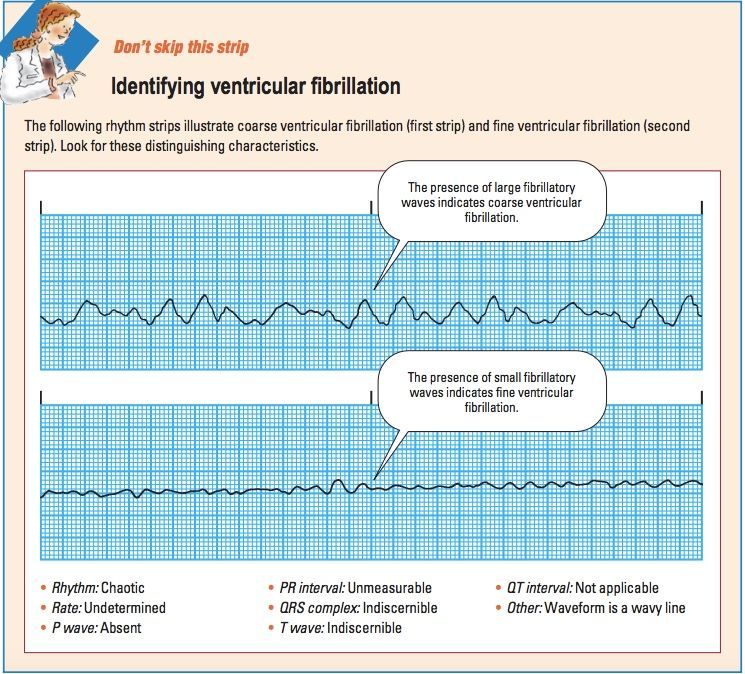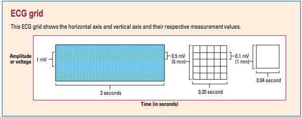 P wave: Atrial depolarization location—precedes the QRS complex amplitude—2 to 3 mm high duration—0.06 to 0.12 second configuration—usually rounded and upright Peaked, notched, or enlarged P waves may represent atrial hypertrophy or enlargement associated with chronic obstructive pulmonary disease, pulmonary emboli, valvular disease, or heart failure. Inverted P waves may signify retrograde or reverse conduction from the atrioventricular (AV) junction toward the atria. PR Interval: location—from the beginning of the P wave to the beginning of the QRS complex duration—0.12 to 0.20 second QRS Complex The QRS complex follows the P wave and represents depolarization of the ventricles. Immediately after the ventricles depolarize, as represented by the QRS complex, they contract. That contraction ejects blood from the ventricles and pumps it through the arteries, creating a pulse. location—follows the PR interval amplitude—5 to 30 mm high but differs for each lead used duration—0.06 to 0.10 second, or half of the PR interval. Duration is measured from the beginning of the Q wave to the end of the S wave or from the beginning of the R wave if the Q wave is absent ST Segment end of ventricular conduction or depolarization and the beginning of ventricular recovery or repolarization location—extends from the S wave to the beginning of the T wave deflection—usually isoelectric (neither positive nor negative); may vary from –0.5 to +1 mm in some precordial leads. ST-segment depression: An ST segment is considered depressed when it’s 0.5 mm or more below the baseline. A depressed ST segment may indicate myocardial ischemia or digoxin toxicity. ST-segment elevation: An ST segment is considered elevated when it’s 1 mm or more above the baseline. An elevated ST segment may indicate myocardial injury. T Wave ventricular recovery or repolarization. Duration is not measured location—follows the S wave amplitude—0.5 mm in leads I, II, and III and up to 10 mm in the precordial leads configuration—typically round and smooth QT Interval ventricular depolarization and repolarization. The length of the QT interval varies according to heart rate. The faster the heart rate, the shorter the QT interval. location—extends from the beginning of the QRS complex to the end of the T wave duration—varies according to age, sex, and heart rate; usually lasts from 0.36 to 0.44 second; shouldn’t be greater than half the distance between consecutive R waves when the rhythm is regular.
